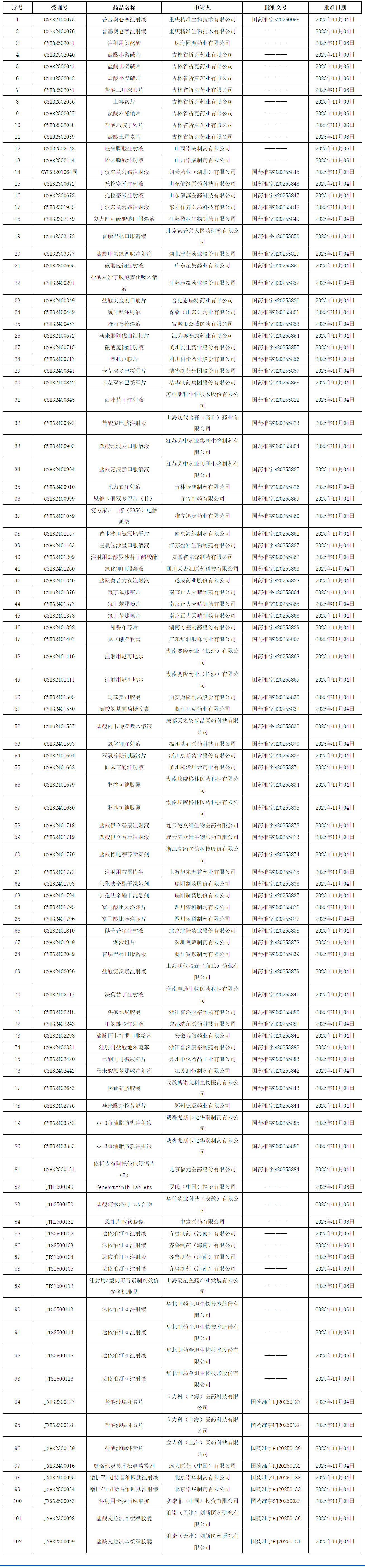 昨日下午,NMPA发布2025年11月10日药品批准证明文件送达信息,本批次共有102受理号获批,包括多款创新药,其中: