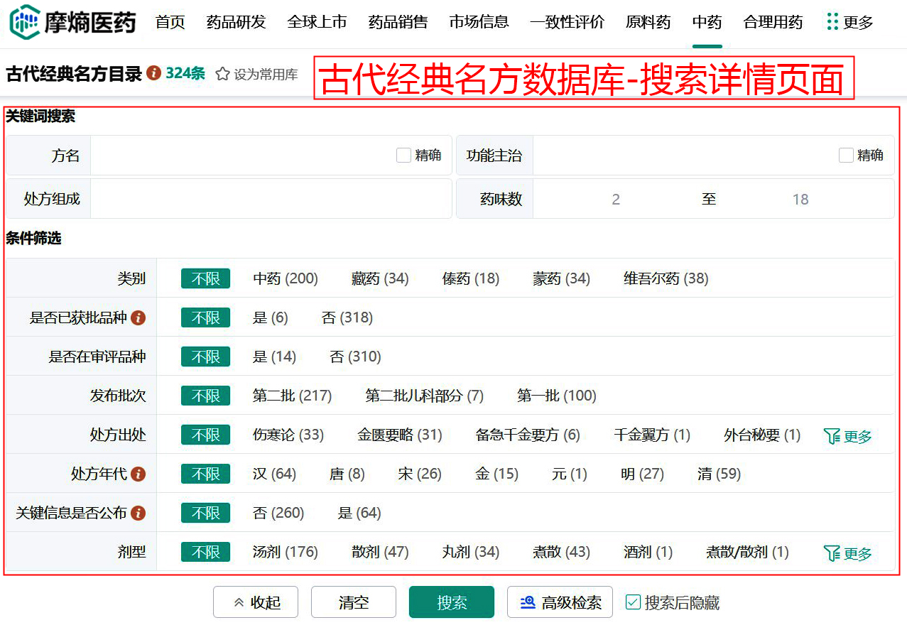 关于古代经典名方目录内容检索,可通过摩熵医药-古代经典名方目录数据库在线查询,该数据库整合国家中医药管理局、国家药品监督管理局发布的各批次古代经典名方信息,提供方名、功能主治、出处、剂型、药味数、审评审批情况、年代等多条件筛选查询,方便目标名方相关信息的高效获取。