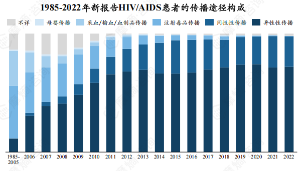 有研究显示,近年来,我国每年报告病例经性传播比例均在 95% 以上,2022年新报告病例中经性传播比例达97.6%,其中异性性传播为72.0%,男性同性性传播为25.6%。