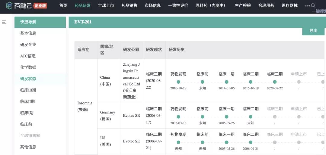 睡眠障碍的新药开发领域:默沙东的苏沃雷生(suvorexant)具有食欲素 1 和食欲素 2 受体双受体拮抗效果,是该类药物中首款获得批准应用的药物;卫材/Purdue Pharma的Dayvigo(lemborexant)于2020年6月在美国获批;其他靶点如京新药业的EVT-201 3期临床处于最后阶段(EVT201是一款GABAA受体的部分正向别构调节剂)。