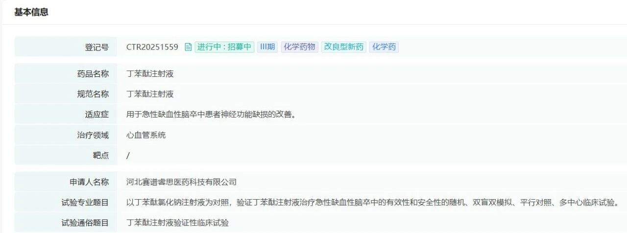 目前,真正推进改良临床的仅河北赛谱睿思一家,正在进行丁苯酞注射液验证性临床试验,招募240人。若III期是突破关键,河北赛谱睿思有望成为首个突围者。