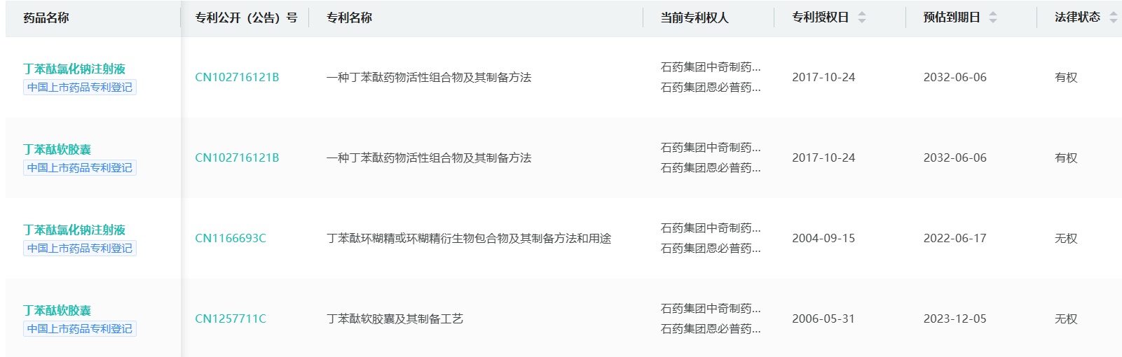 本身丁苯酞没有化合物专利,软胶囊和注射剂的制备方法专利也陆续到期,但在2024年4月,石药给丁苯酞的专利“续了命”,将组合物和制备专利延迟到2032年,使绕过难度大幅增加。