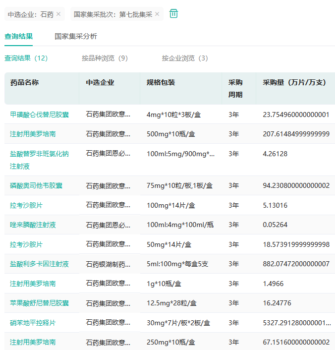 石药集团中选第7批集采的品种