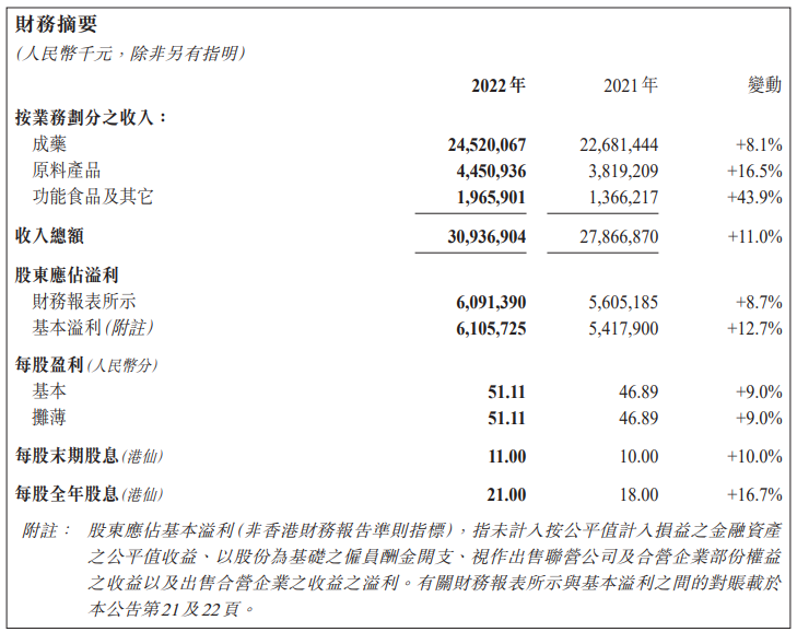 同日,石药集团公布2022年度业绩。期内集团实现收入总额人民币309.37亿元,同比增长11.0%;股东应占溢利人民币60.91亿元,同比增长8.7%;每股基本盈利人民币51.11分,宣派末期股息每股11港仙,全年合共派息每股21.00港仙。