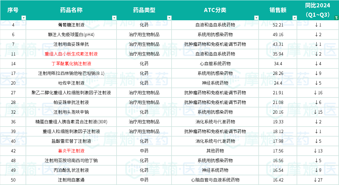 2025年全终端医院注射剂TOP50品种(不分)名单(标红为独家品种)
