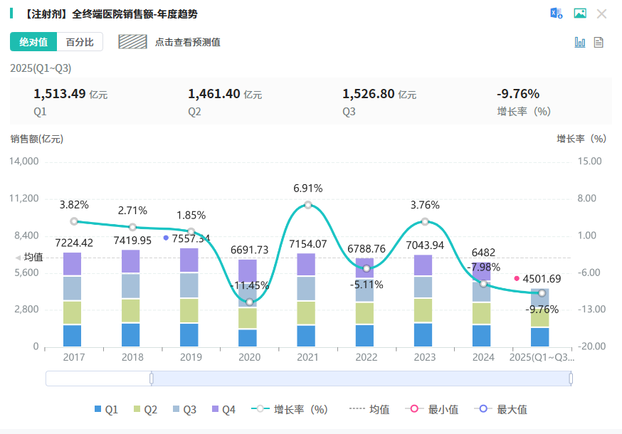 回顾近年走势:2018-2023年注射剂销售额在6691.73亿~7557.34亿元间波动,2020年因多重因素探底至6691.73亿元,2023年回升至7043.94亿元;2024年受宏观与政策影响回落至6482亿元,降幅约7.98%。进入2025年,前三季度同比再降9.76%,显示行业进入阶段性调整。