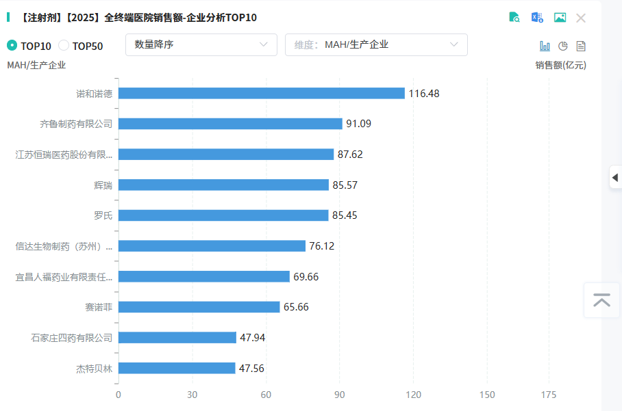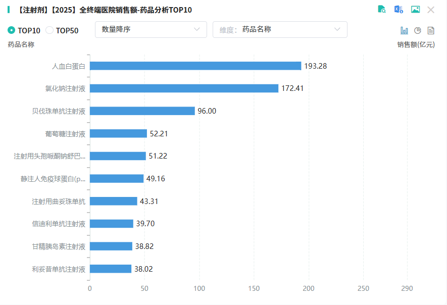 在生物药主导的结构下,2025年前三季度TOP10注射剂药品占整体市场份额17.2%,市场集中度适中但竞争白热化。。其中人血白蛋白、氯化钠注射液两款销售额均超170亿元;其余品种销售额均在38亿元以上,展现出注射剂赛道的庞大体量与活跃度。