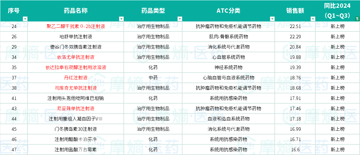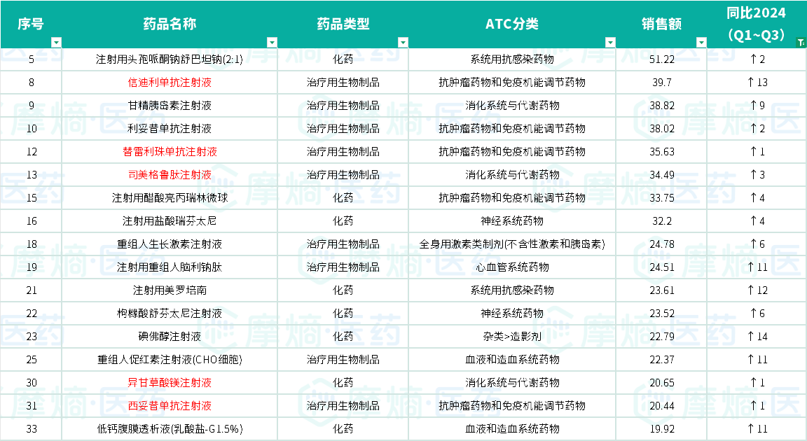 其中,安进的依洛尤单抗注射液以19.88亿元销售额新晋上榜,并录得92.26%的同比暴涨,成为增速最猛的独家注射剂。