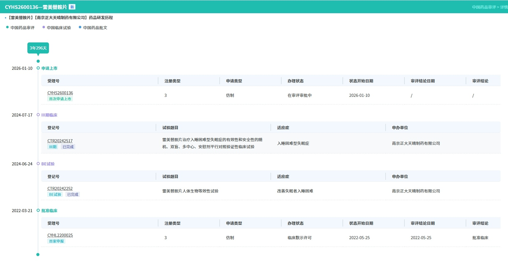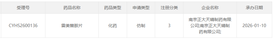 1月10日,CDE官网最新公示,南京正大天晴制药按化药3类提交的雷美替胺片上市申请获得受理(受理号:CYHS2600136)。由于原研药暂未进入国内市场,南京正大天晴成为国内首家冲击该品种首仿的企业,失眠治疗领域有望迎来一位重磅选手。