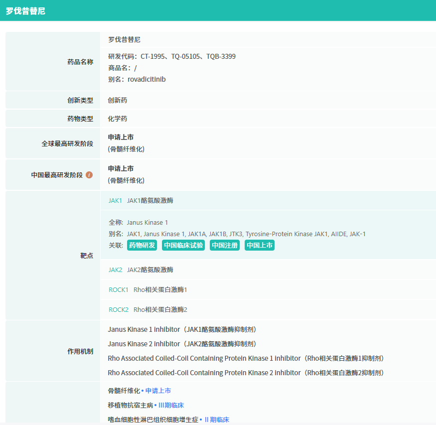 从研发轨迹看,这款“十年磨一剑”的创新药跑出了加速度:2019年启动临床试验,2024年7月提交上市申请,2026年2月顺利获批,本次获批的骨髓纤维化是首发适应症,而针对移植物抗宿主病的新适应症也已经处于III期临床研发中,并在2025年8月被CDE纳入突破性治疗程序;在美国也已获准开展 II 期临床,全球化脚步同步提速。