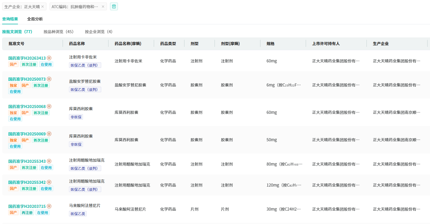 作为正大天晴在抗肿瘤与免疫调节领域的“新王牌”,罗伐昔替尼 的上市进一步夯实了其创新药矩阵。目前,该公司在这一领域已有超40款药的生产批文,既包括安罗替尼(超30亿大品种)、安奈克替尼等1类创新药,也覆盖阿达木单抗、贝伐珠单抗等生物类似药。