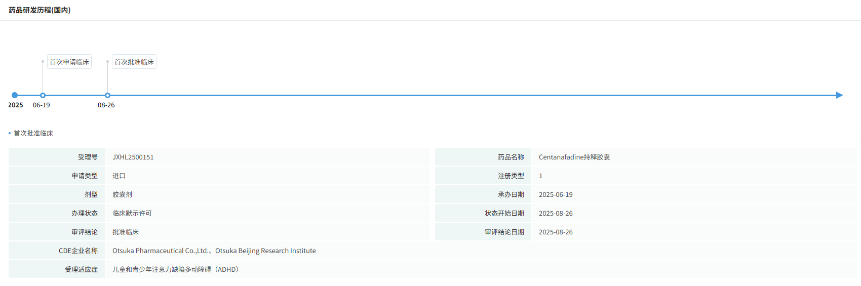 近日(8月26日),国家药品监督管理局药品审评中心(CDE)官网更新公示,日本大冢制药(Otsuka Pharmaceutical)申报的1类新药Centanafadine持释胶囊正式获得临床试验默示许可,拟用于治疗儿童和青少年注意力缺陷多动障碍(ADHD)。这也意味着全球ADHD治疗领域将迎来首个潜在“first-in-class”三重再摄取抑制剂(NDSRI),为数百万患者及家庭带来新希望。