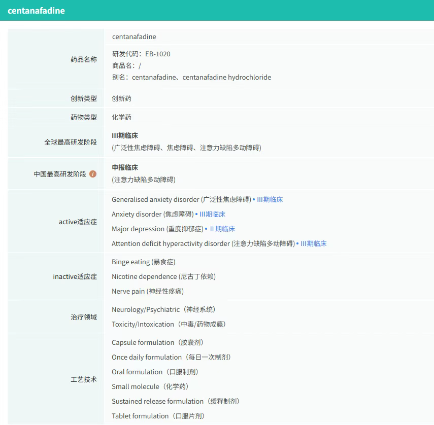 作为全球精神神经领域领导者,大冢制药的ADHD产品线已覆盖布瑞哌唑、阿立哌唑等。Centanafadine作为原创性新药,目前在美国、日本同步开展Ⅲ期临床,预计2026年提交全球新药申请(NDA)。此次中国临床获批,是其“全球同步研发”战略的重要一步。