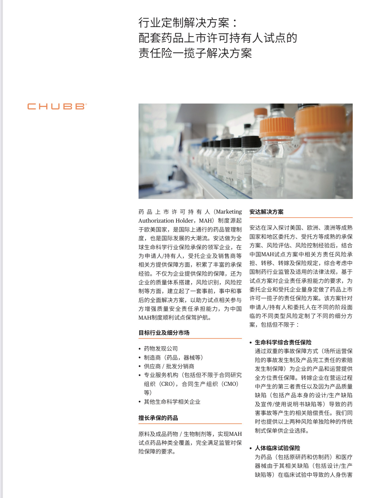 华泰保险作为生命科学行业保险的市场领导者,于2000年进入中国市场,前后为超过350家生物制剂、化学制药,器械、中药及食品增补剂公司提供过风险保障方案。自2013年上海张江生命科学园区进行CMO试点项目以来,华泰联合股东公司安达积极参与相关责任风险保险保障方案的探讨和制定,在2016年6月MAH制度正式颁布后华泰专门邀请公司负责全球生命科学的总监在中国与相关企业和政府机构召开专题研讨会,为参与MAH试点的企业量身定制责任险的解决方案。