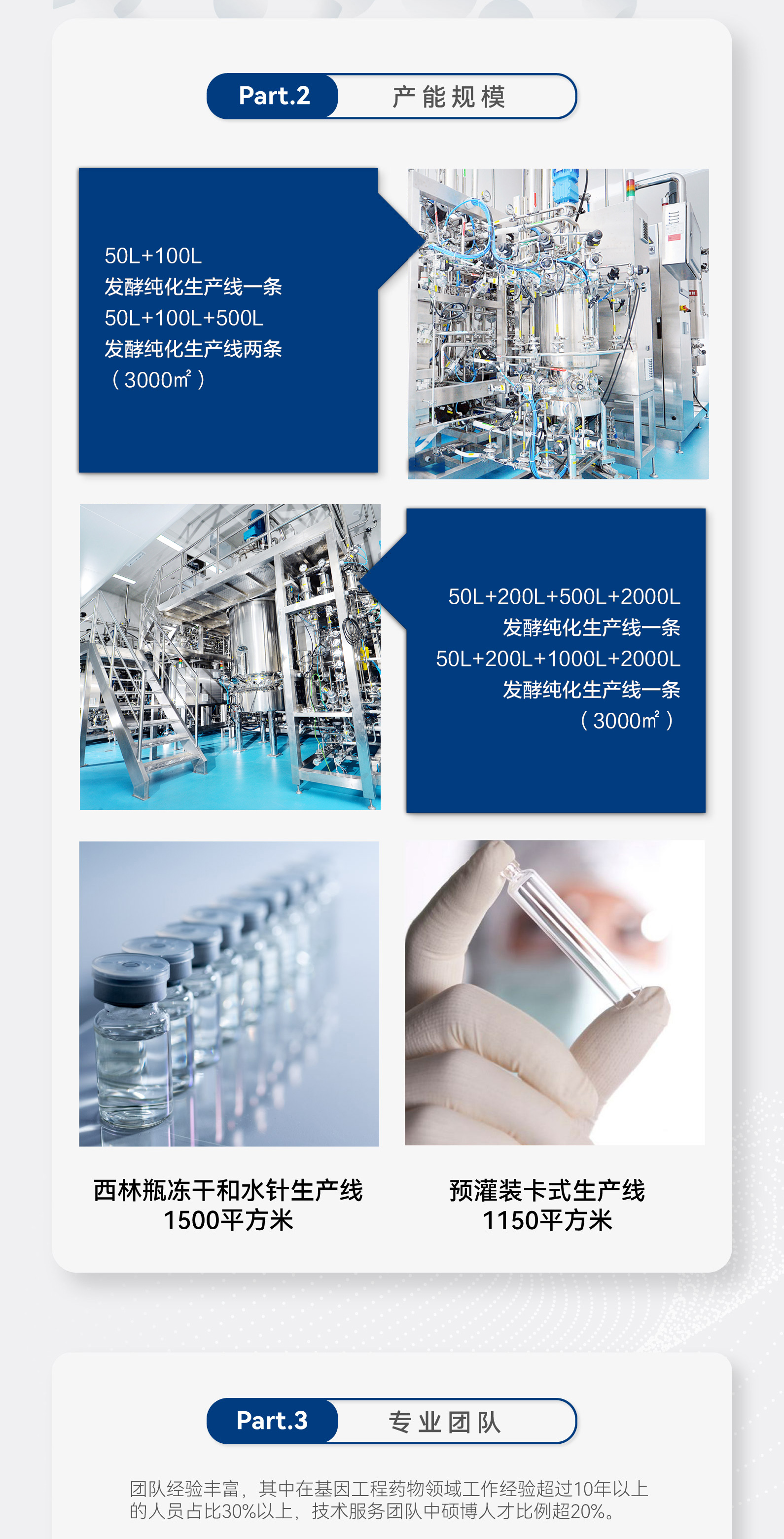 产能五条原液生产线,总发酵规模7500L 50-140L 50-500L*2 50-200-500-2000L 50-200-1000-2000L