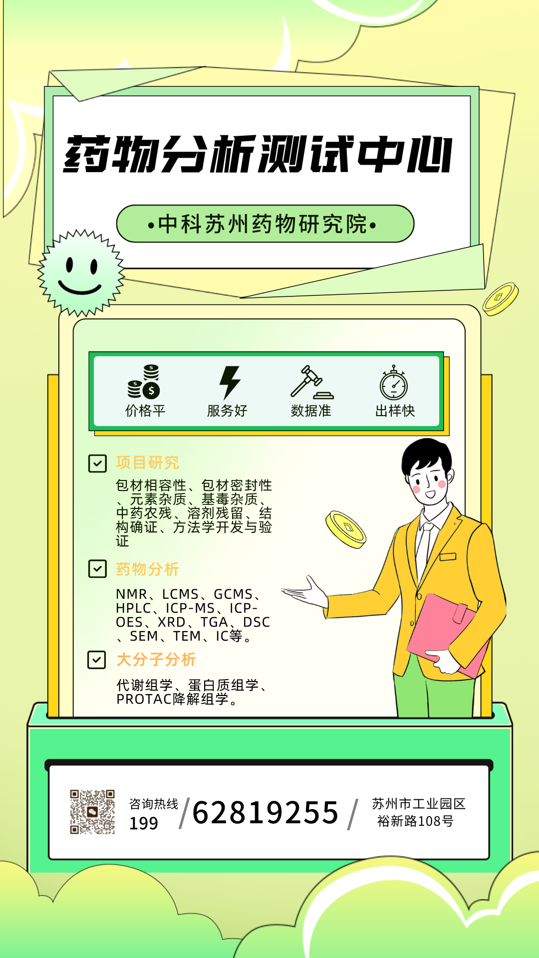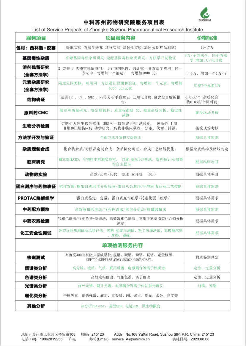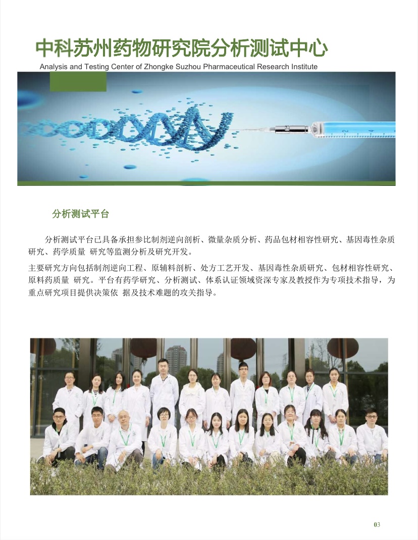 苏州苏研药物分析测试科技有限公司(简称:中科苏州药物研究院分析测试中心),2019年6月成立,中心拥有核磁(NMR),气相色谱-质谱联用检测仪(GC-MS)、液相色谱-三重四极杆质谱联用检测仪(LC-MS)、电感耦合等离子体发射光谱仪(ICP-OES)、电感耦合等离子体质谱仪(ICP-MS)、高效液相色谱仪(HPLC)、气相色谱仪(GC)、元素分析仪,离子色谱、高分辨质谱LC-HRMS、紫外、红外、粉末衍射XRD、扫描电镜SEM、透射电镜TEM、热分析仪TGA\DSC等数十种各种高端检测仪器设备,并已经通过实验室计量认证(CMA)。