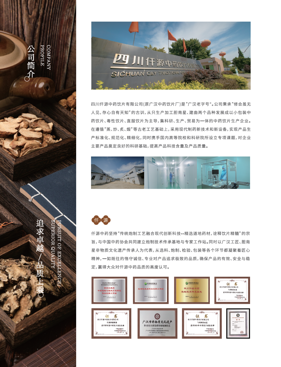 公司秉承“修合虽无人见,存心自有天知”的古训,从最初仅生产加工胆南星、建曲两个品种,逐步发展成为以毒性饮片、小包装中药饮片、直服饮片为主导的现代化中药饮片生产企业。与国内高等院校和科研院所紧密合作,为企业核心产品奠定了坚实的科研基。如今,仟源中药已成为集科研、生产、贸易为一体的综合性中药饮片生产企业,并拥有多项发明专利。