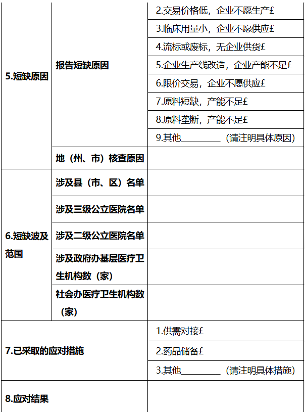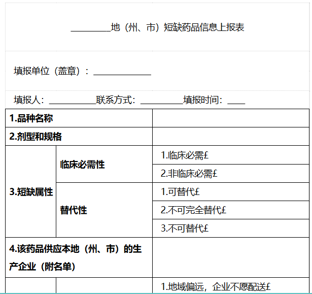 通过供需对接、药品储备等方式无法有效解决的,应及时将药品短缺情况、短缺原因、已采取措施、应对结果等,通过全国短缺药品信息直报系统逐级上报。特殊情况也可由地、州、市卫生健康委填写《短缺药品信息上报表》(附件)上报自治区卫生健康委。