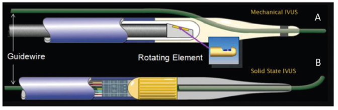 图 1 IVUS成像导管的两种类型(A,机械旋转式;B,相控阵式)