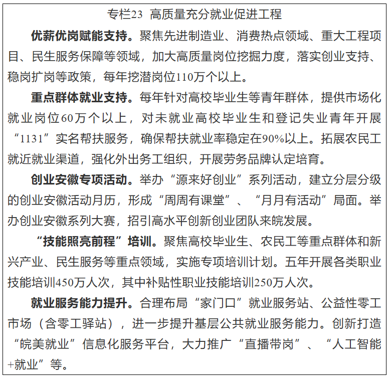 稳定和扩大就业容量。深入实施就业优先战略,健全就业促进机制。实施稳岗扩容提质行动,支持吸纳就业能力强的服务业、中小微企业和劳动密集型企业发展,积极推动重点领域、重点行业、城乡基层和中小微企业岗位扩容,大力培育新职业新岗位,推动灵活就业、新就业形态健康发展。实施高校毕业生等青年就业服务攻坚行动,完善农民工就业、培训、权益维护一体化服务。做好就业援助,兜牢困难群体就业底线。深入研究、积极应对外部环境变化和人工智能等新技术发展对就业的影响,建立重大政策制定、重大项目确定、重大生产力布局就业影响评估机制。五年累计新增城镇就业340万人左右。