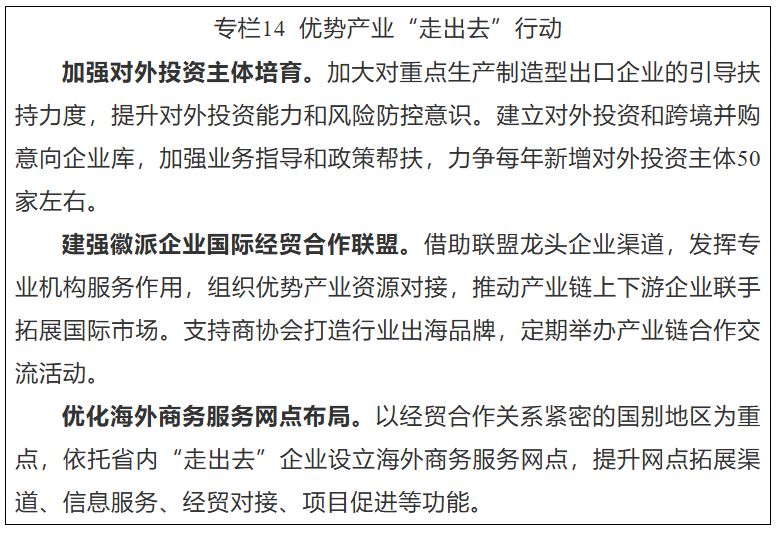 加强涉外安全治理。完善涉外国家安全机制,积极做好反制裁、反干预、反“长臂管辖”斗争,深化国际执法安全合作。加强海外安全保障体系建设,健全贸易风险防控机制,开展重点“走出去”企业境外安全培训,强化“皖企出海”法律服务,护航企业海外安全。