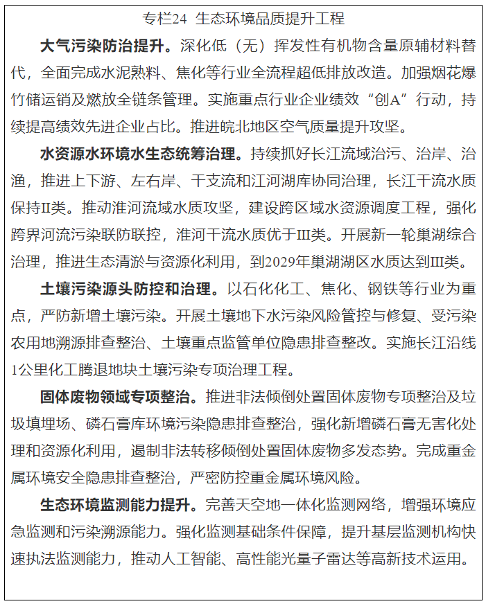 深入打好蓝天、碧水、净土保卫战。实施空气质量持续改善行动,推动水泥、玻璃、铸造、有色、焦化等行业及工业窑炉深度治理,强化工业源和移动源治理,促进氮氧化物和挥发性有机物协同减排,持续开展扬尘精细化管控,不断降低PM2.5浓度。深入推进大江大河和重要湖泊保护治理,改善引江济淮工程输水线路水生态环境,做好大运河生态环境保护修复,加强饮用水水源保护,补齐城乡雨污管网基础设施短板。持续开展土壤污染源头防控行动,加强农业面源污染综合治理,基本完成受污染农用地土壤重金属溯源排查整治,推动危险废物填埋量占比稳中有降。强化新污染物协同治理,推动解决噪声、油烟、恶臭等群众身边环境问题。