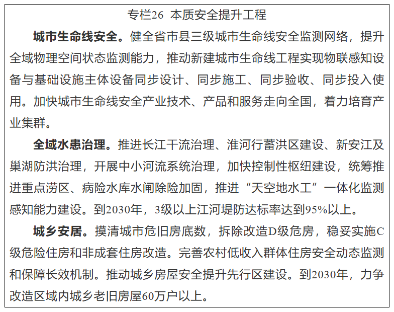 推动安全生产治本攻坚。深入开展安全生产专项治理,统筹人防、物防、技防建设,加强监测预警和风险隐患排查处置,制修订一批行业安全生产技术标准、管理标准。开展重点场所安全设施升级改造,加快矿山、危险化学品、燃气、交通运输、建筑施工、工贸、民爆、特种设备等领域老旧设备淘汰更新,推动安全生产治理模式向事前预防转型。实施煤矿重大灾害超前治理、非煤矿山“三个一批”、化工园区“十有两禁”安全整治提升以及道路交通规划与建设、公路桥梁消险除危、基层消防综合整治等重点工程。加强城市地质调查和地质安全风险防控。