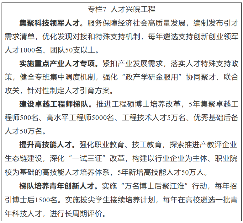 推进高素质技能人才队伍建设。构建覆盖全体劳动者、贯穿全生命周期、服务全产业链的高素质技能人才队伍培养体系,促进劳动者提技就业增收。深化“三转四像”办学模式改革,推行长学制培养,探索“技能+工程师”、“技能+学历”培养模式。实施技能强企行动,构建产教评技能培训生态链。健全省、市、县三级公共实训体系,支持建设一批公共实训基地和高技能人才培养平台。推行“岗位需求+技能培训+技能评价+就业服务”四位一体项目化培训,打造“皖工徽匠”技能培训品牌。深化技能人才评价改革,全面落实新“八级工”职业技能等级制度。健全多层次职业技能竞赛体系,推动赛事成果转化应用。建设技能友好型企业和技能型社会基本单元。到2030年,全省技能人才总量达到950万,其中高技能人才330万。