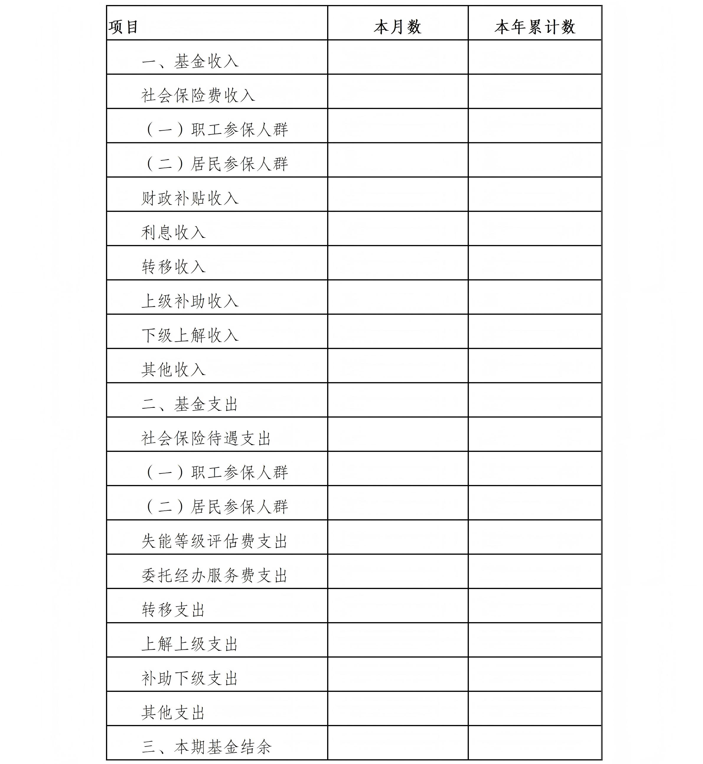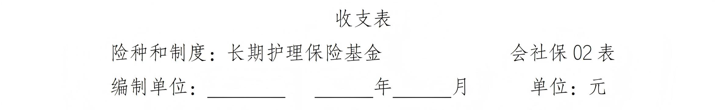 编制长期护理保险基金收支表时,应当在“社会保险待遇支出”和“转移支出”项目之间增加“失能等级评估费支出”、“委托经办服务费支出”项目,在“社会保险费收入”、“社会保险待遇支出”项目下增加“(一)职工参保人群”、“(二)居民参保人群”子项目。具体格式如下: