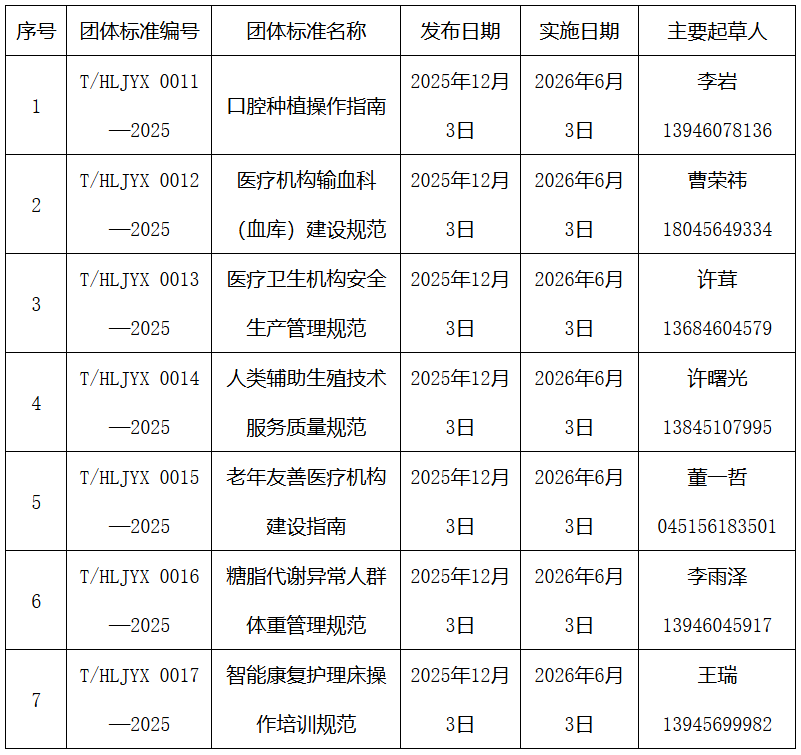 根据《团体标准管理规定》《黑龙江省医学会团体标准管理办法(试行)》有关规定,《医疗卫生机构安全生产管理规范》《老年友善医疗机构建设指南》等7项团体标准已完成立项、起草、社会公开征求意见、卫生健康领域及标准化专家技术审查等标准制定程序,黑龙江省医学会现批准予以发布。2025年黑龙江省卫生健康团体标准批准发布目录(7项)见附件。