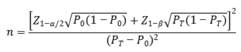 上述公式中,n为样本量;Z1-α/2、Z1-β为显著性水平和把握度的标准正态分布的分数位,P0为评价指标的临床可接受标准,PT为试验体外诊断试剂评价指标预期值。