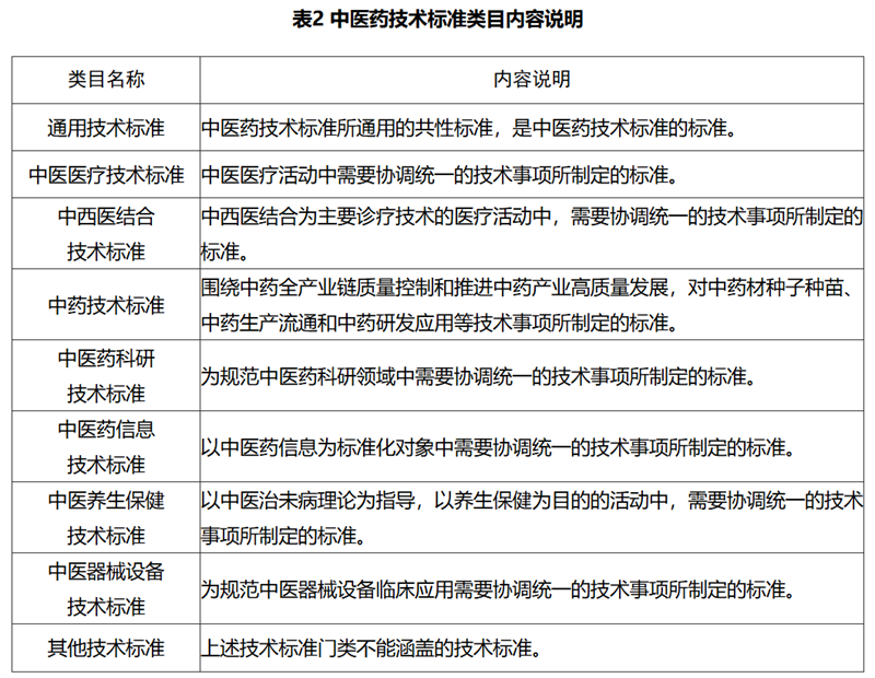 2.中医药技术标准,是指为规范中医药行业中需要协调统一的技术事项所制定的标准。包含9个类目,各类目内容说明见表2。