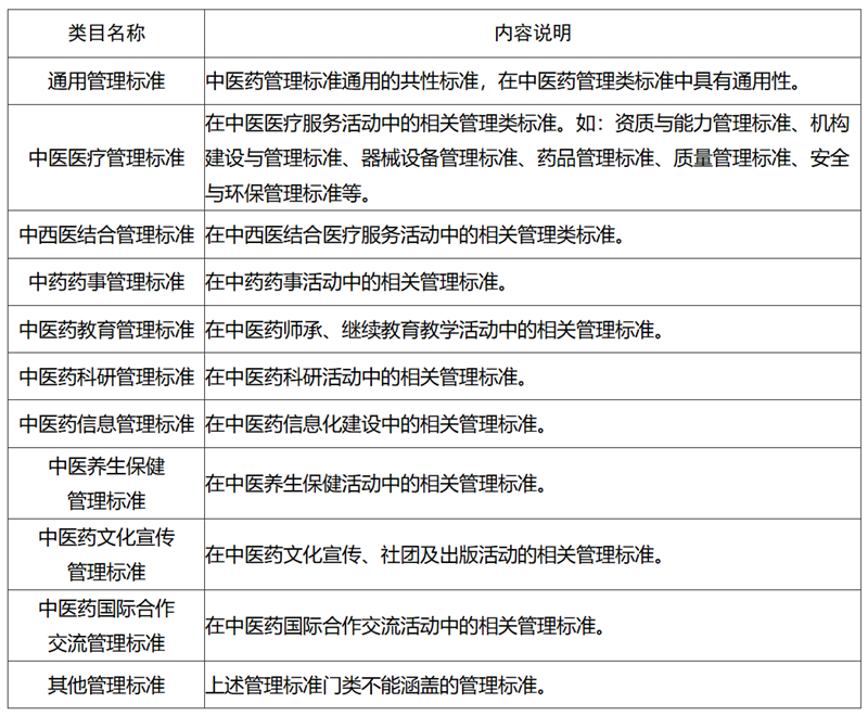 3.中医药管理标准,为规范中医药行业管理,对中医药领域中需要协调统一的管理事项所制定的标准,是管理机构为行使其管理职能而制定的具有特定管理功能的标准。包含11个类目,各类目内容说明见表3。