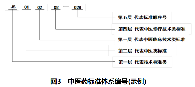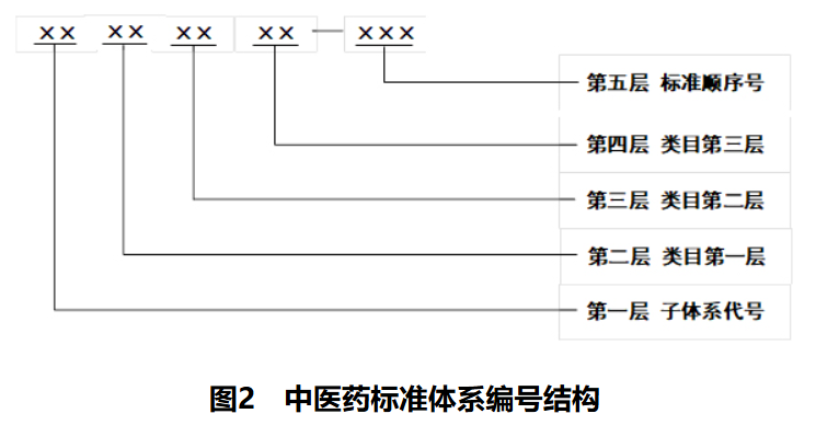 中医药标准体系的层次编号和标准代号采用二节式,以短横线分开,前面的是层次序列子体系代号和类目代号,后面的是顺序号。中医药标准体系编号结构如图2所示。