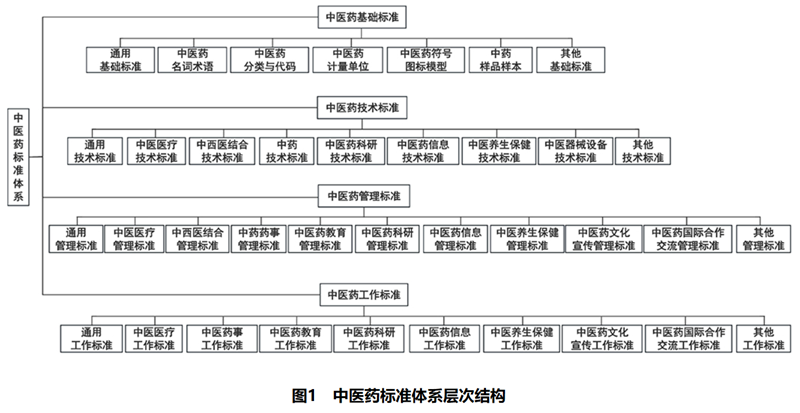 (一)总体结构。中医药标准体系分为基础标准、技术标准、管理标准和工作标准4个子体系,每一子体系下分为若干类目。主要的层次结构,如图1所示。