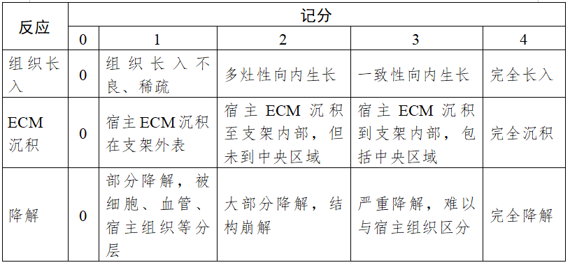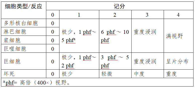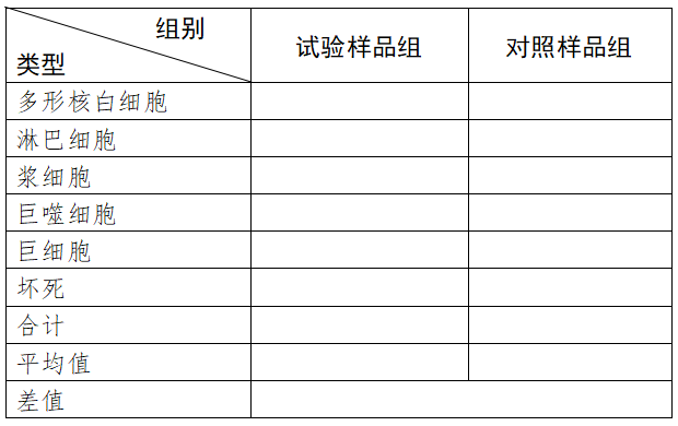 按表4进行组织学半定量评价。分别计算试验样品组及对照样品组的各项记分之和,除以样本总量,得到记分平均值。以试验样品组平均值减去对照样品组平均值进行修复组织区炎症反应的比较(负值记录为零)。