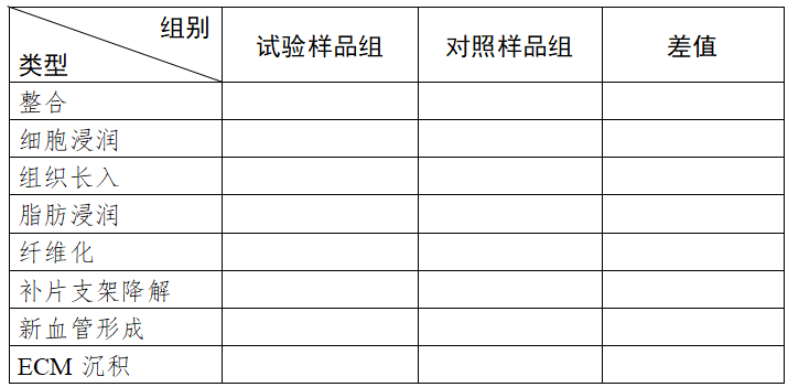 按表5进行组织重塑再生评价。分别计算试验样品组及对照样品组的各项记分,除以样本总量,得到记分平均值。以试验样品组平均值减去对照样品组平均值进行组织重塑再生效果比较(负值记录为零)。