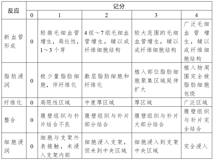 术后各处死时间点(包括补片完全降解的终点),直视观察确认修复区有无疝发生(直视以观察到明显疝环或腹部体表明显凸起、凸起高度超过1cm确认疝发生),必要时通过影像学观察确认腹腔内容物脱出情况。若发现疝发生,应确认疝发生因素为手术因素(补片固定脱离)或补片因素(补片降解后无再生组织),并进行记录。