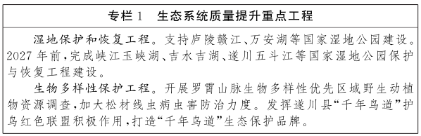 1.系统性保护流域水生态。建设多元化生态保护修复投入机制。支持打造吉安(千烟洲)山水林田湖草生命共同体试验区。全面推进水土流失综合防治,加强江心洲(岛)生态保护修复。落实水资源刚性约束制度,强化江河源头集水区等重要水源涵养区用途管控。加强赣江干流以及支流源头区等区域生态保护和治理修复。推动小水电绿色改造和现代化提升。开展国土绿化行动,提升森林碳汇功能。建立健全水生生物资源调查监测体系,加强水产种质资源保护区、水生生物关键栖息地的管理和保护修复。巩固提升赣江干流天然水域禁捕退捕成果,稳妥推进人工增殖放流和湖库生态渔业发展,全面加强外来入侵物种防控与治理。