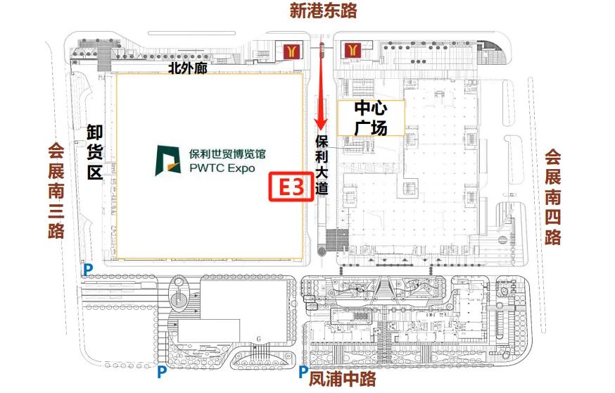 线路1(约50分钟):由【广州南站】出发,搭乘地铁2号线,于【昌岗站】换乘8号线抵达【琶洲站】,C/D出口方向PWTC(保利世贸博览馆)出口直达。