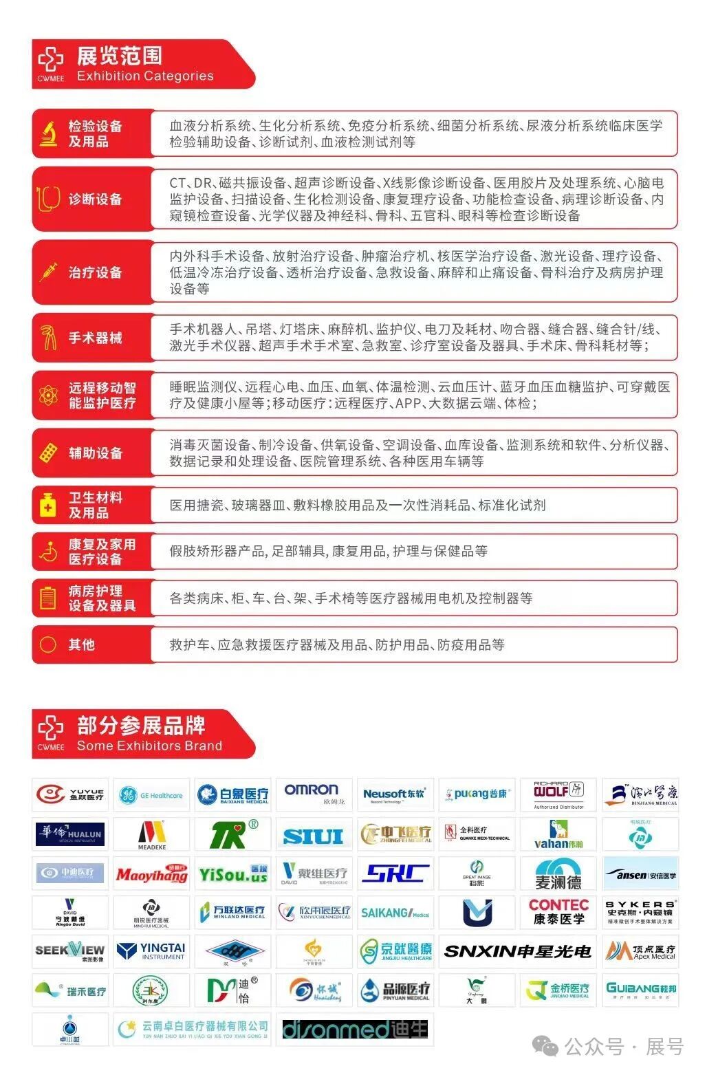 展览范围涵盖医疗器械、诊断设备、影像学设备、实验室设备、康复设备、护理用品、药品及生物制品、健康管理与监测设备、医疗信息技术、医院管理解决方案、医疗耗材、消毒与清洁设备、远程医疗技术、医疗教育与培训服务等,满足全产业链需求。