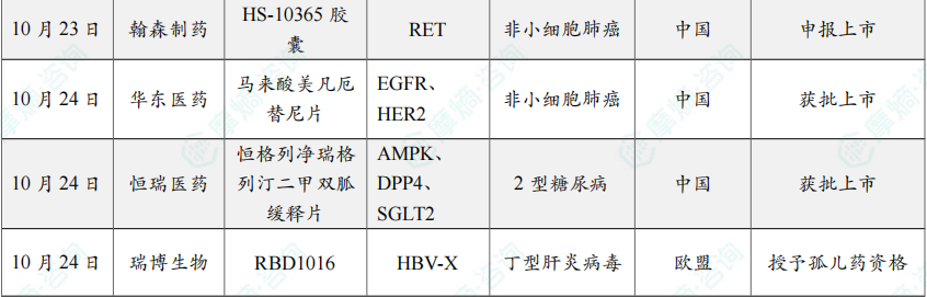 10月24日,国家药监局(NMPA)官网显示,华东医药的马来酸美凡厄替尼片(曾用名:迈华替尼)获批上市,用于表皮生长因子受体(EGFR)21号外显子L858R置换突变的局部晚期或转移性非小细胞肺癌(NSCLC)成人患者的一线治疗一线治疗。