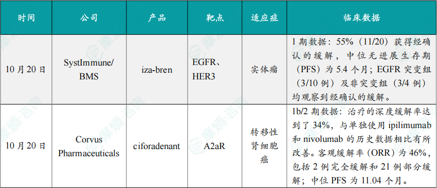 10月20日,SystImmune公司与百时美施贵宝公布其全球1期研究 US-Lung-101 的安全性和有效性数据。该研究评估了ADC疗法 iza-bren 在多种肿瘤患者中的疗效与安全性。