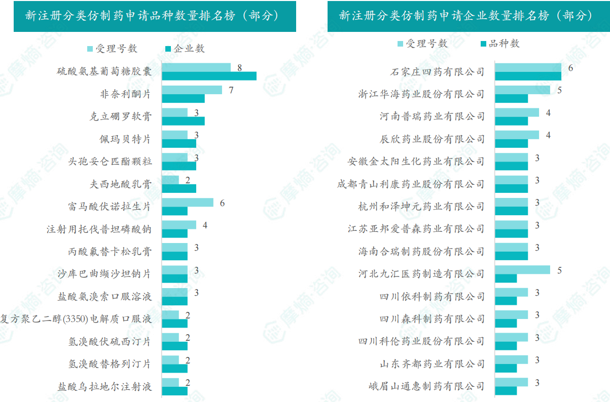硫酸氨基葡萄糖胶囊为申请企业数最多的品种,有11家;石家庄四药有限公司是申请品种最多的企业,有6个品种。