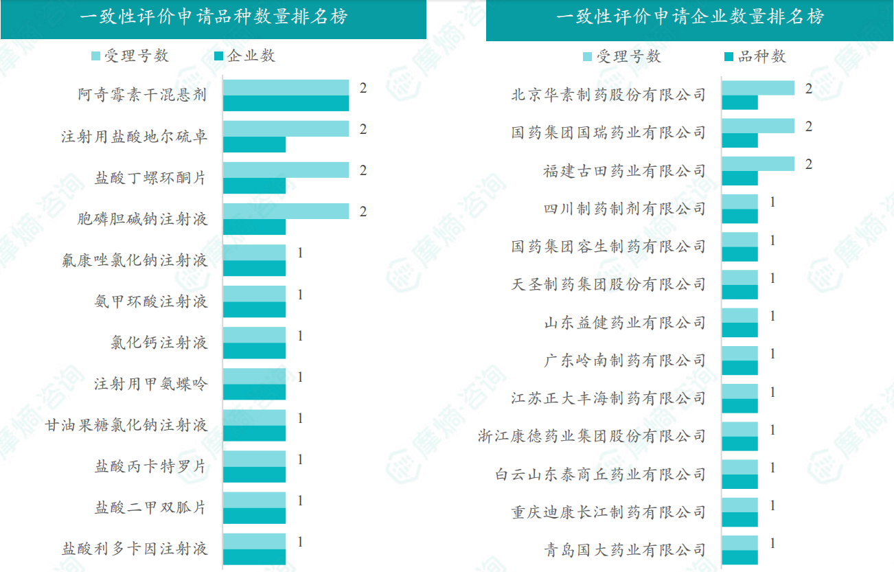 阿奇霉素干混悬剂、盐酸丁螺环酮片、胞磷胆碱钠注射液和注射用盐酸地尔硫卓为受理号最多的品种,有2个;各企业申请品种数均为1个。