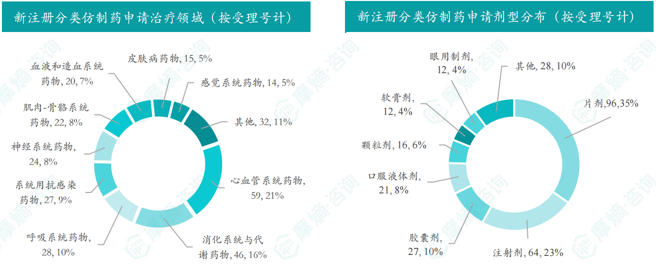 - 申请品种主要为神经系统药物,申请剂型主要为注射剂;