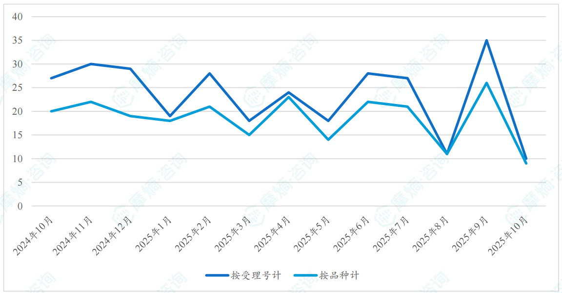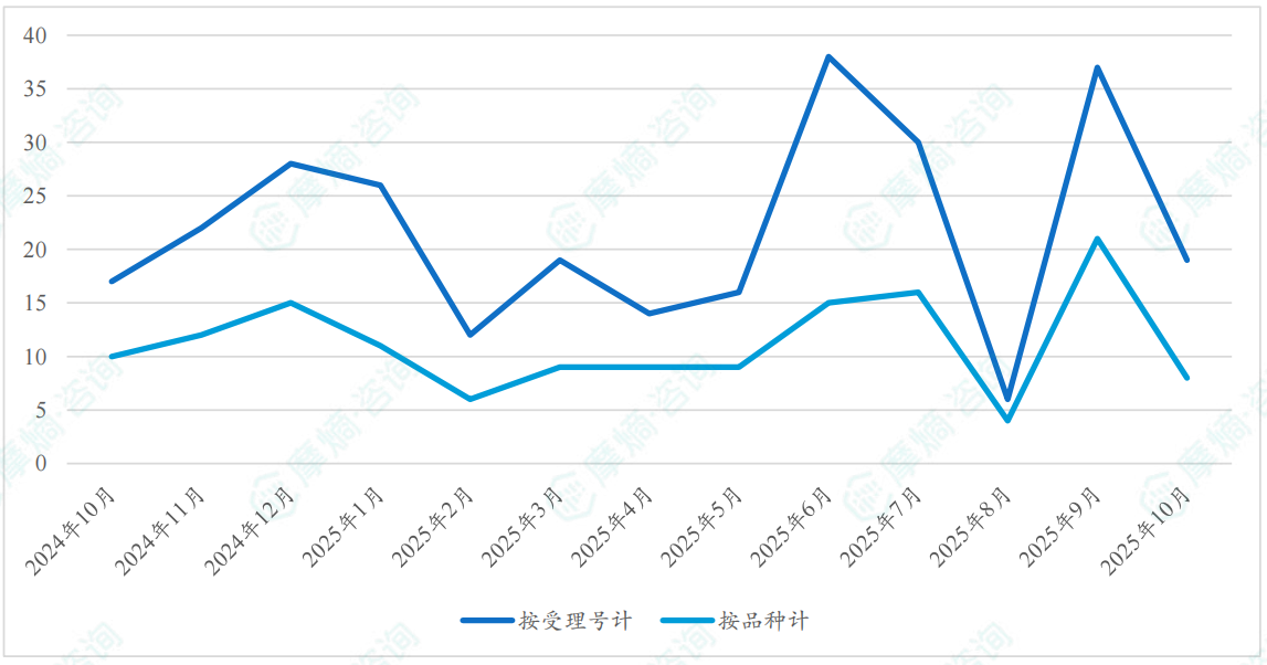 根据摩熵医药数据库统计,2025年10月期间共有276项(共计186个品种)新注册分类仿制药申请获CDE承办,其中新注册分类临床申请20项,新注册分类上市申请256项。
