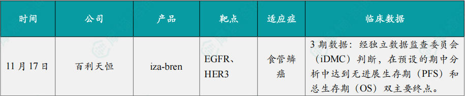 11月17日,由百利天恒自主研发的全球首创(First-in-class)、新概念(New concept)且唯一进入III期临床阶段的EGFR×HER3双抗ADC(iza-bren)在晚期食管鳞癌的III期临床试验(研究方案编号:BL-B01D1-305)中,经独立数据监查委员会(iDMC)判断,在预设的期中分析中达到无进展生存期(PFS)和总生存期(OS)双主要终点。这是全球首个ADC药物在食管癌治疗中取得PFS、OS双阳性结果的III期临床研究,适应症为既往经PD-1/PD-L1单抗联合含铂化疗治疗失败的复发性或转移性食管鳞癌。