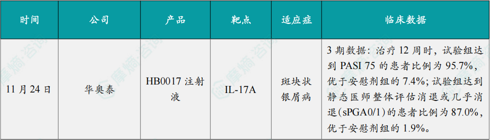 11月24日,华奥泰宣布,其自主研发的HB0017注射液治疗中重度斑块状银屑病的关键性3期临床研究已完成揭盲,达到所有主要和关键次要终点。新闻稿表示,这一积极结果为公司向中国国家药监局(NMPA)提交上市申请奠定基础。HB0017注射液是一款以白介素-17A(IL-17A)为靶点的单克隆抗体,拟用于治疗中重度斑块状银屑病、强直性脊柱炎及其他自身免疫疾病。