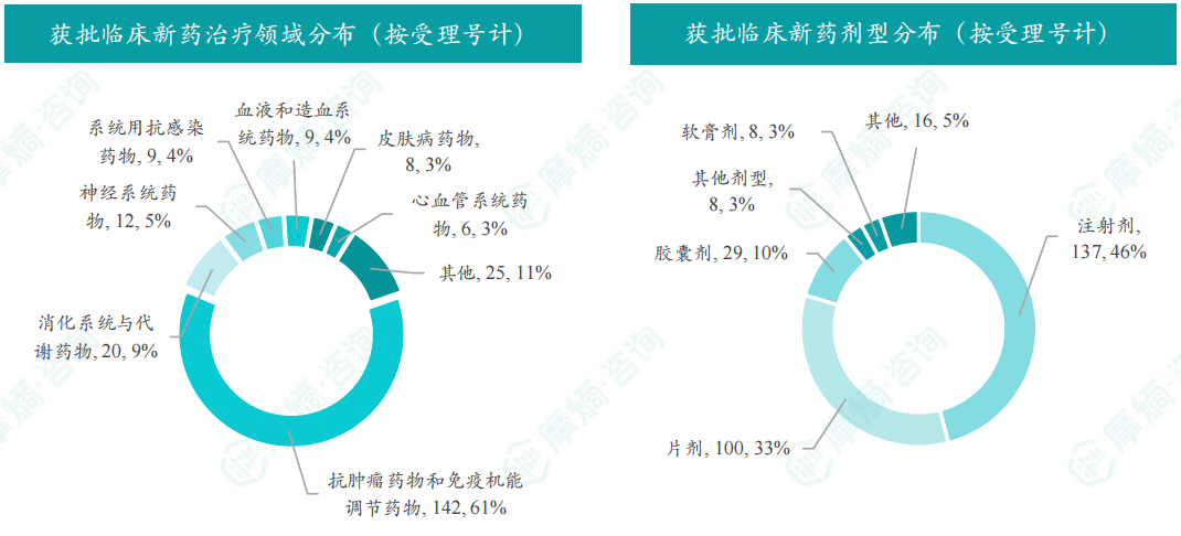 11月获批临床受理号数量最多的新药为抗肿瘤药和免疫机能调节药物,有142个,占比61%,消化系统与代谢药物获批数量也比较多,有20个。获批剂型主要为注射剂与片剂,分别有137个,100个。